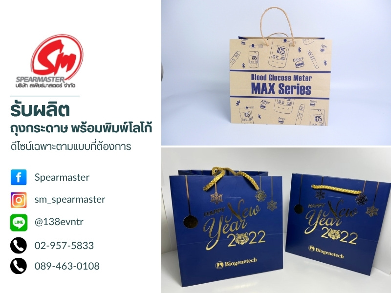 รับผลิตออกแบบถุงกระดาษ พิมพ์โลโก้ บริการผลิตและออกแบบถุงกระดาษทุกรูปแบบ ถุงกระดาษคุณภาพไม่ขาดง่าย ผลิตถุงกระดาษ พิมพ์โลโก้ ถุงกระดาษแฟชั่น ถุงกระดาษเคลือบเงา ถุงช้อปปิ้งพรีเมี่ยม ถุงใส่ของ ถุงหูหิ้ว ดีไซน์สวย คุณภาพดี ราคาโรงงาน รับผลิตถุงกระดาษตามแบบ และตามความต้องการของลูกค้า  ถุงกระดาษ พิมพ์โลโก้บริษัท ถุงกระดาษ ใส่ของที่ระลึก ถุงกระดาษ ลดโลกร้อน ถุงกระดาษ ใส่ของพรีเมี่ยม ถุงกระดาษแฟชั่น ถุงกระดาษเคลือบเงา สนใจสั่งผลิตและออกแบบถุงกระดาษ พิมพ์โลโก้ ติดต่อ : โทร : 02-957-5833  Hotline : 089-463-0108 อีเมลล์ : spearmaster.mmm@gmail.com ดูสินค้าและโปรโมชั่นเพิ่มเติมได้ที่ : www.spearmaster.net